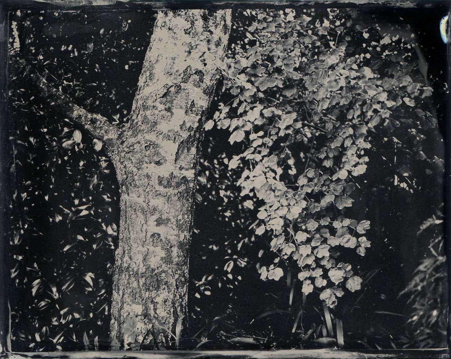Below you can see the 5×4 inch plate that was coated with collodion, sensitised in a silver nitrate bath, exposed to the tree scene above, developed with ferrous sulphate back in the darkroom then fixed with Sodium Thiosulphate and finally washed/dried.